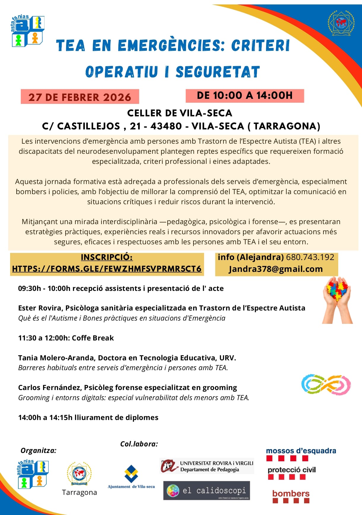 El 27 de febrero, de 10.00 a 14.00 h, en Vila-seca (Tarragona) se llevará a cabo una jornada formativa sobre actuaciones policiales con personas con TEA. (personas con Trastorno del Espectro Autista) y otras discapacidades.